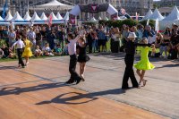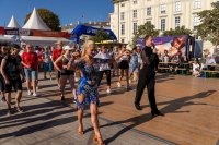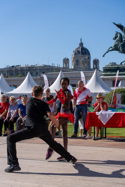 Großer Andrang herrschte den ganzen Tag über am Stand des ÖTSV. Bei (viel zu) heißem Spätsommer-Wetter haben sich zahlreiche Paare des TSK Danceland, UTSC Forum Wien, TSC Eleganza Köflach, TSK Modena und TSK Schwarz-Gold Wien bereit erklärt, unseren Sport in den verschiedenen Leistungsklassen vorzustellen. Nicht nur die hohen Temperaturen, auch die aus Baubrettern bestehende Tanzfläche haben den Paaren alles abverlangt - und sie haben ihre Sache gut gemacht! Das Publikum war begeistert und hat auch die Einladung zum Erlernen des Wiener Walzers mit Jaqcueline Mokrzycki und des Cha-Cha-Cha mit Tim Grabenwöger&Alina Molochnikova bereitwilligst angenommen.